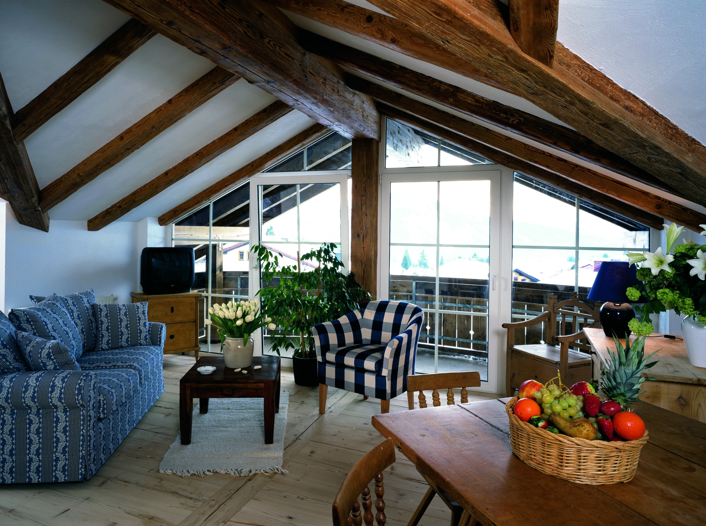 Urgemütliche im Landhausstil eingerichtete Ferienwohnungen mit alten Balken Bauernmöbel aus Altholz, offenen Küchen und bequemen Sitzgruppen, Aussichtsbalkone oder Terrassen, liebevoll ausgestattet.
